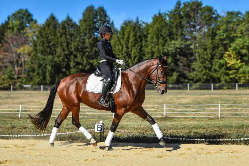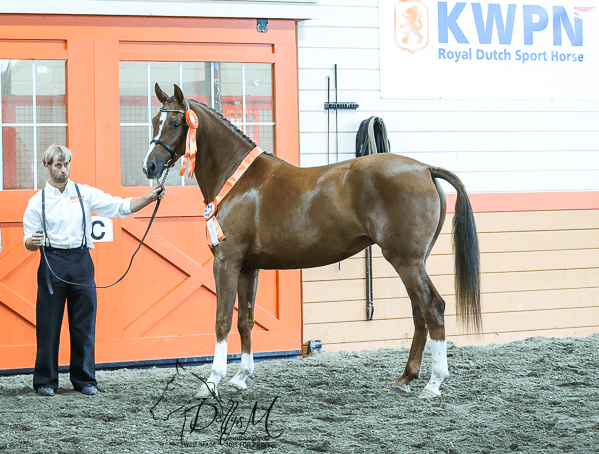 A strongly built mare with good connections in the body and a correct foundation. Her walk is clear and active, the trot had so much rhythm and power; her hindleg is well connected. She is well balanced, with good mechanics and power. Half sister to Grand Prix horse, Godot SSF. At the Keuring tour in 2024, she received 80/80, ster and keur eligible. With this score, she won the third place in the North American Keuring Top Tens.